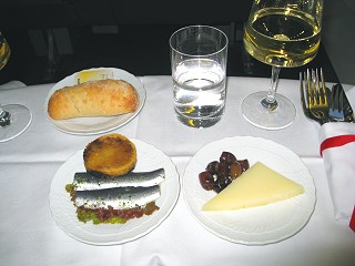 前菜にはタッジア産のオリーブとカチョカヴァッロチーズ、アンチョビのマリネ、一口大のポテトピッツァとさすがイタリアの飛行機だなぁと思わせるメニューです。アンチョビのマリネが見た目よりも美味しい