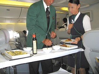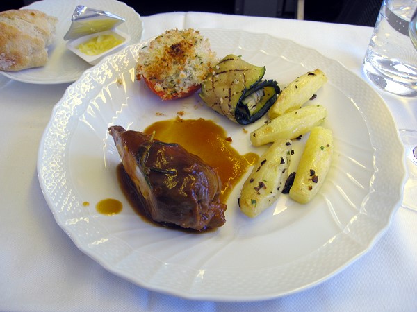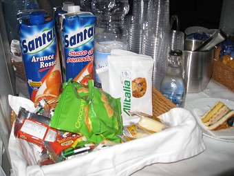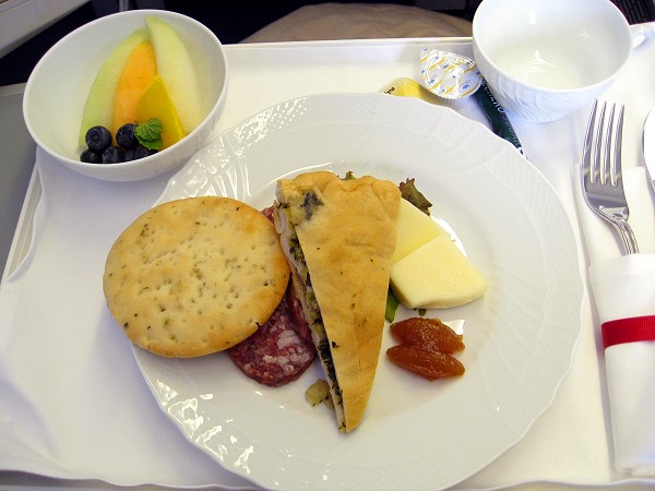 到着前の2回目の機内食はモッチァレラチーズとかりんのゼリー固め"コトニャータ"、イタリアンサラミ、オリーブオイルの香り豊かな野菜を詰めた暖かいピッツァ。オリーブオイルとオレガノ風味のフォカッチャ。季節のフルーツ
