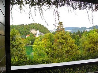 ブレッド湖に面したホテルで、部屋の窓からブレッド湖が見られます緑が一杯