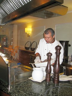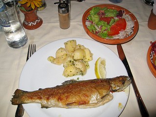 ベジタブルスープとマスのグリル、アップルパイでした。マスはちょっと生臭いニオイがします