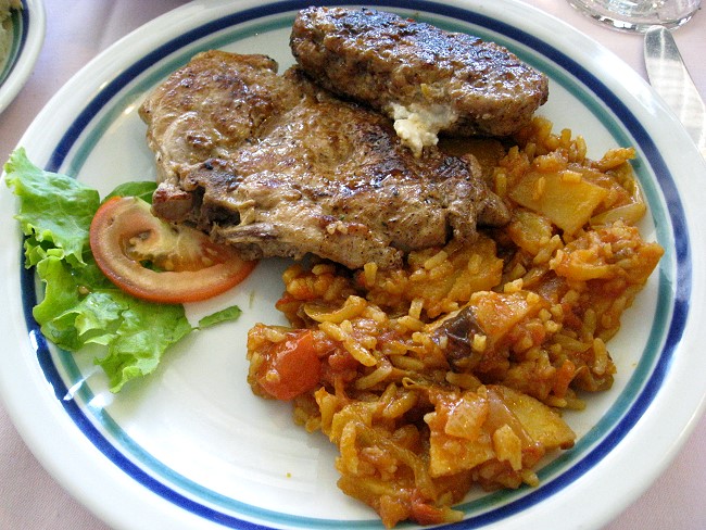メインに豚肉のソテーとハンバーグ。トマトライスリゾット風でした。ちょっと味が濃かったけど非常に美味しくて日本人の味覚に合っていて美味しかった〜。昼から夜並みのボリュームランチを食べ過ぎてしまいました  |