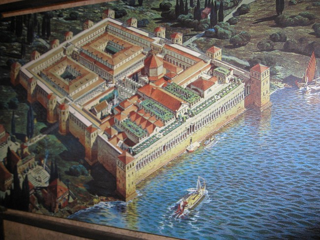 ディオクレアヌス宮殿が宮殿として使われていたその当時の絵、海に面して船で寄港するしかないような要塞都市になってますね。正面の小舟らしきものがある正面入り口から私達も城内に入りました。
