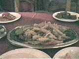 メニュー:エイシとタヒーナ、ヨーグルト、野菜の酢漬け、イカフライ、魚の塩焼き、エビの塩焼き、チャーハンみたいなご飯もありました。しかし、食べきれる量じゃないのだ。 |