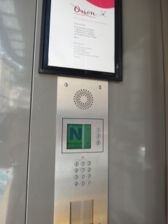 | 今回泊ったホテル選びについての詳細は後で書くとして最初の難関はこの入口である。このホテルはラファイエットの生活館の上に位置しているので普通のホテルのように誰でも入れるってわけにはいかない。4桁の暗証番号を入れないとこのドアが開かないのでフロントにもたどりつけないらしい。その番号は時々変わるらしいが予約した時にそういう連絡がなかったので結局日本から電話して聞いた。 |