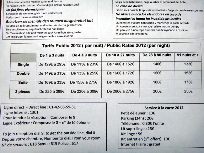今回はホテルに直接予約を入れたのだが、私の泊った時期で1日180ユーロ。6泊するのでトータル1080ユーロでした。泊る時期と何日間かで料金が変動するようですが、実際の所、料金体系は良く分からないままだったけど。コピーしていった予約完了場面の料金と同じ金額をチェックイン時に支払った。101円で計算されてたので円高でラッキー。と思っていたら滞在中にどんどん下がり97円まで下がったのでチェックアウトに支払えたら数千円は違ったなぁ。 |