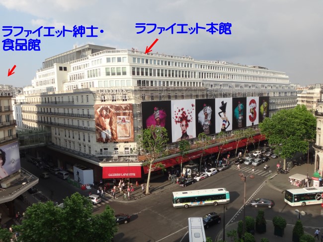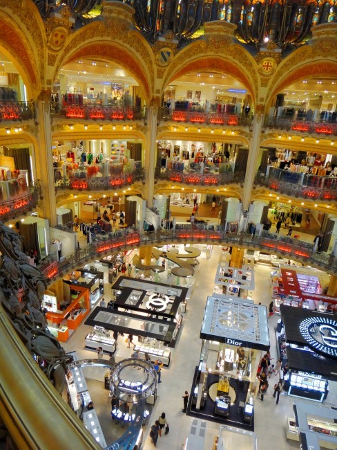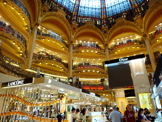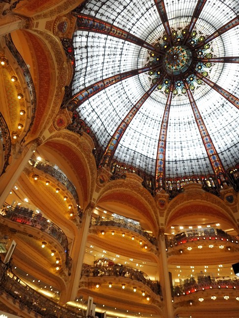 | ラファイエット本館の天井。前にもここをぽか〜んと口を開けて見ておりましたが、これを見るとあ〜パリに来たんだなぁと実感出来ます。 |