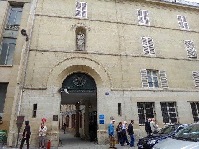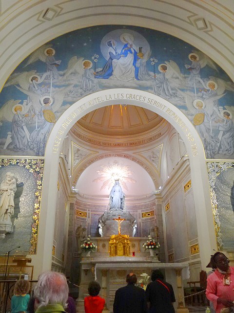 こちらもちょっと見つけにくい教会です 「奇跡のメダル教会」あるいは「奇跡のメダイ教会」、「奇跡のメダイユ教会」とかいろいろな呼び方があるようですが、フランス語でメダイユはメダルのことで、この教会で売っている「奇跡のメダル」を求めて、世界中から観光客が来るのです。マラソンで世界を1周した寛平ちゃんもここに寄っていましたね。 |