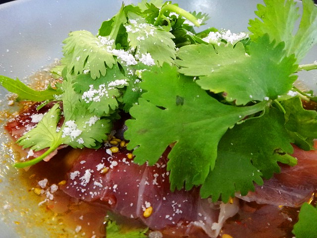 こちらは生ハムの豆と煮込んであるものなんですが、味は表現出来ません。塩味なんですが、う〜〜〜ん、食べた事ない味です。上に乗っているのはパクチーなので私はパクチーをよけて食べました |