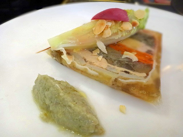 これは「フォアグラのテリーヌ ジャガイモ添え」周りのコンソメのゼリー寄せがアクセントになっていて美味しいです。彼女が選んだ一品ですが、ジャガイモの何とかって書いてあったんですが、どれがじゃがいも  って感じでした |