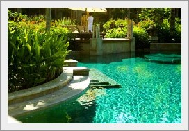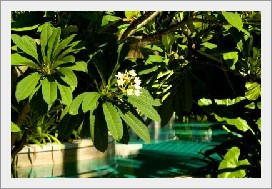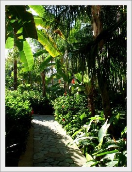 プールに通じる道もジャングル風で南国ムード満点ず。