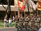 朝のんびりと食事をとっていたらホノルルのメインストリートが何やら賑やか・・・。何か良くわからないパレードが?どうも戦争に行っていた兵士の退役パレードのようなんだけど、沿道で拍手が起こっていました。日本人観光客も訳も分からず拍手していたけど、いいの〜!?日本との戦争のだったらちょっと問題有りじゃないの!?(笑)