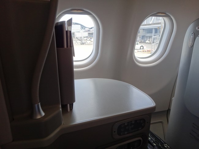 ビジネスクラスのシート互い違いに配置されているで殆どが一人ずつの席になってます |
