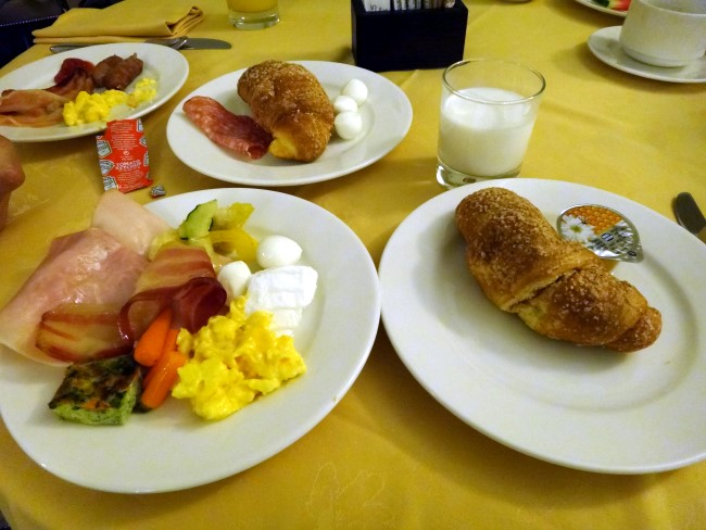生野菜が少ないのは外国では珍しくないですが、いつものようにパンとハムベーコン、たまごなどチョイスしてまいりました。元気に頂きます |