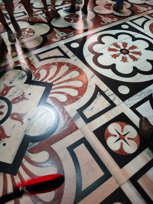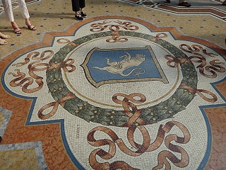んで、この牡牛のモザイクが一番有名で、かかとでこの牡牛の上をくるっと回ると幸せなことがあるんだってさ、こういうの日本人が欠かす訳ないですよね。勿論みんなで順番に回ってみました |