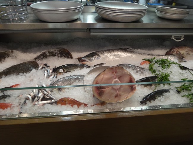 シーフードのお店のようで生魚が陳列されてます ツアーじゃ無かったらここでお魚を選んで注文するんだろうな |