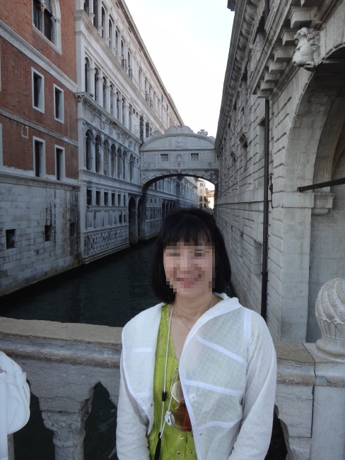 有名な「溜息橋」の前でパチリ こういう水路が数多くあります。ここをゴンドラで行き来するんだな〜 |