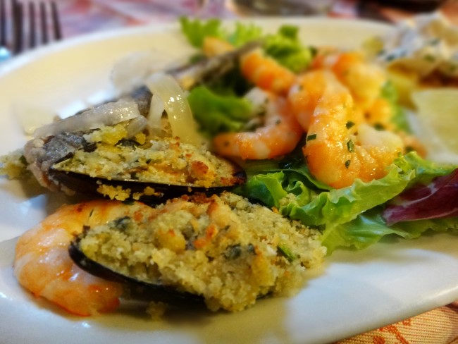 ムール貝の香草焼き、イワシのマリネ、海老のグリル、ポテトのサワークリーム添え