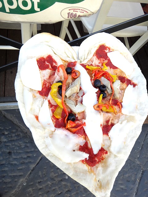レストランの店先で見つけたのはハートのピッツァって おっしゃれ〜 |