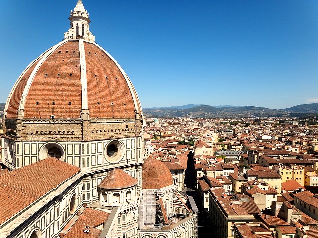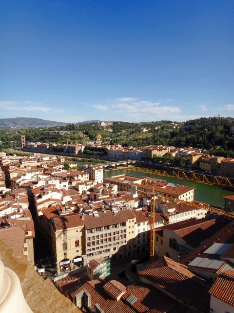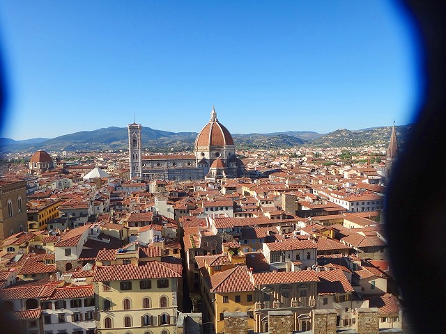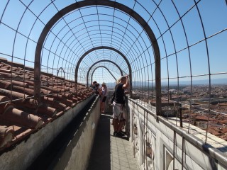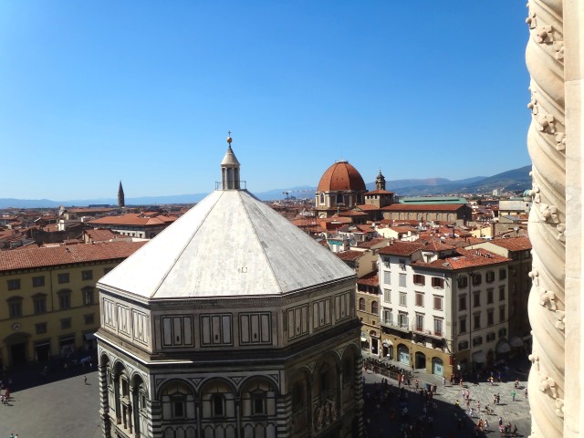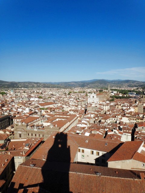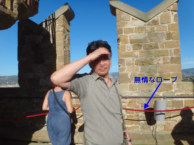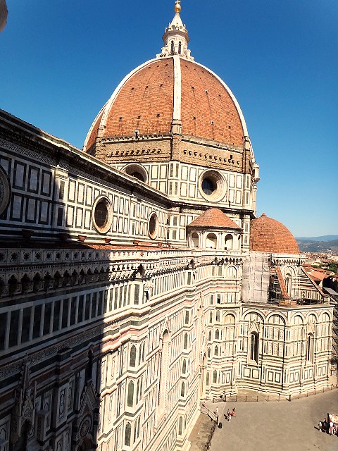 ひぇ〜、この高さ 「クーボラ」に登っている人と同じ高さくらいかしら 丸い「クーボラ」の屋根とフィレンツェの街並みを一緒に写真に収められるからこのアングルやっぱ最高じゃないですか 頑張って階段上がった甲斐があるというものです |