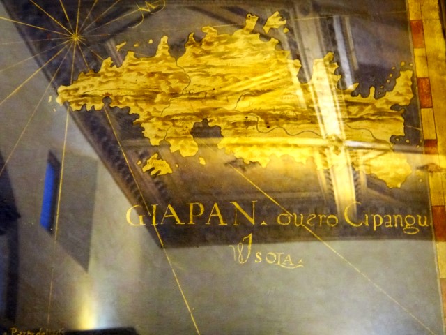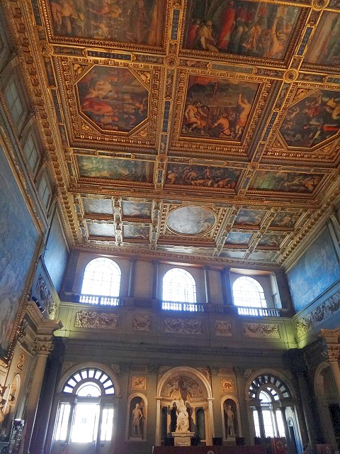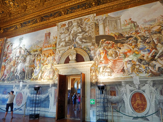 この「500人大広間」は2007年にイタリア文化庁が「レオナルド・ダ・ヴィンチ」の幻の壁画「アンギアーリの戦い」が「ヴァザーリの壁画」の裏側に隠されていると発表したので有名です |