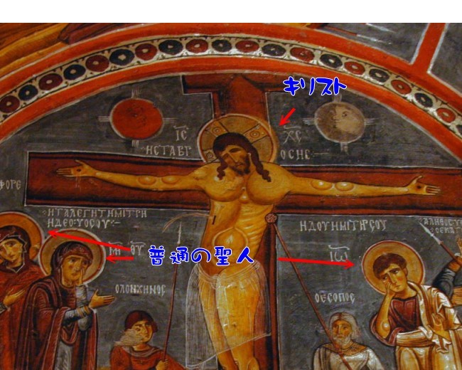 今回初めて知ったことがある。パンフから拝借した写真で説明すると、こういう写真で「天使の輪」を頭に載せているキリスト教の絵をよく見るが天使の輪が十字架になっているのがイエスキリストだそうな。はー、そう言われれば違うわぁ〜