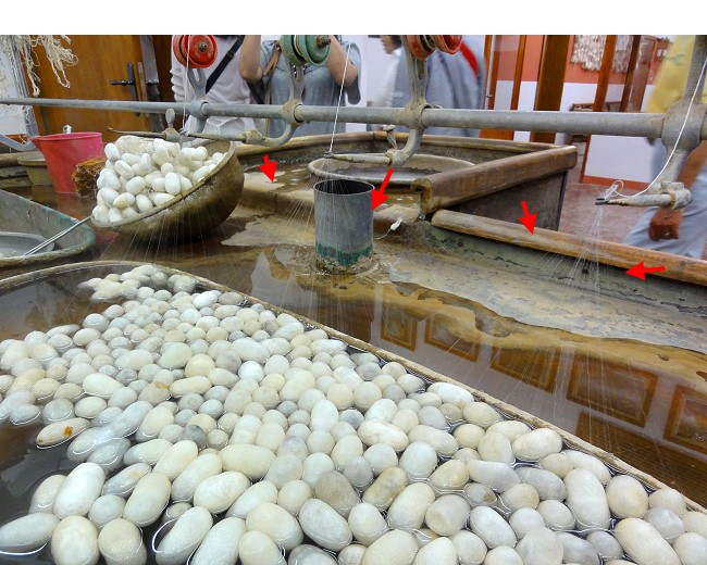 これ凄いんですよ〜、シルク糸が出来るまでの行程。シルクの糸の取り方も見学。1個の繭から1本ずつの糸を300本集めてようやく1本の色糸の元となる。極めて細い糸の集団でできてるんだな、驚きました