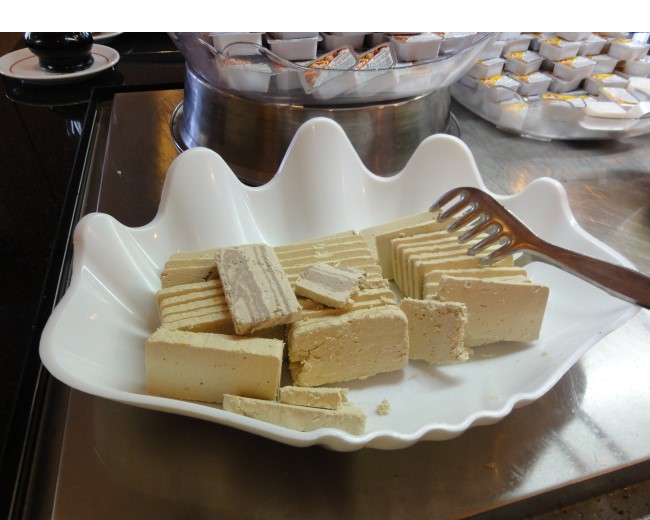 何かはわからないけどナッツ系の甘いバターみたいな物。サクサクしてて美味しい〜 。私はパンにつけて食べてましたが本当の食べ方はわかりません |