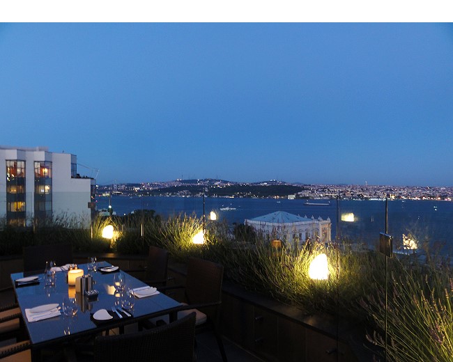 | お部屋から外を見ると、ホテルのプールとボスポラス海峡が見える |
