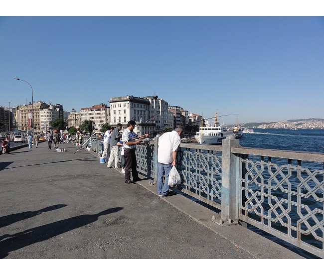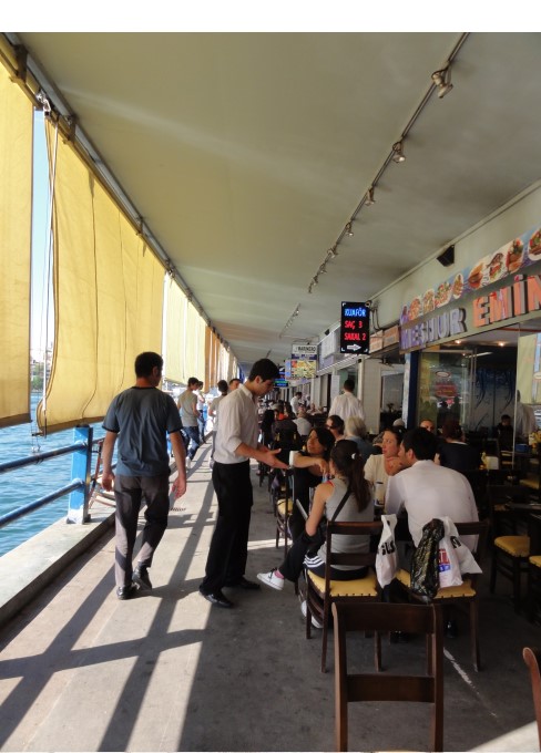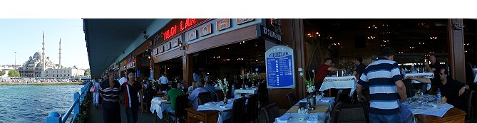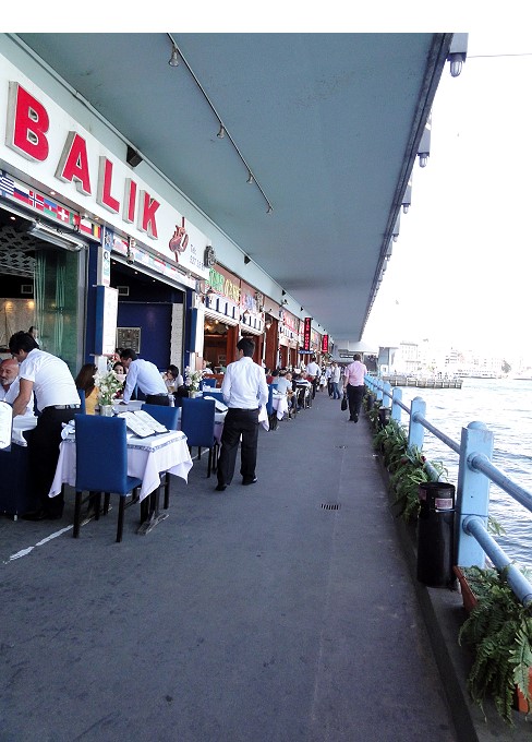 ガラタ橋は上は道路、下はレストラン が並ぶ2重橋になってます。美味しそうなシーフードのレストランが軒並み並んでます |