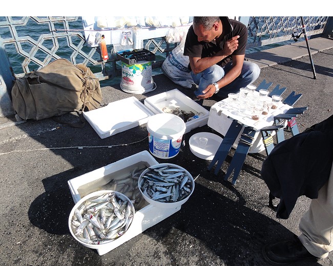 | 右がイワシ、左はアジでした。から揚げにしたら美味しいだろうなぁ〜。サビキで釣ってます。 |