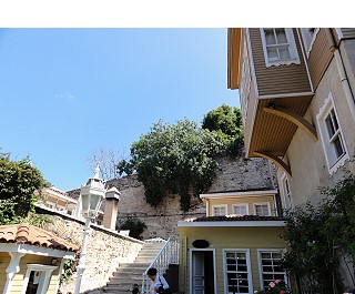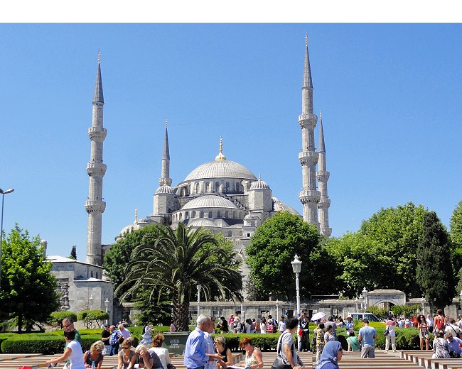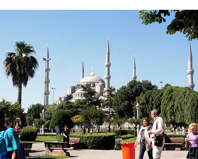 | ささ、出発ですよ〜。イスタンブール市内は見どころ満載なんですから。もうすでに目の前にモスクが見えますね。バスで10分、15分で旧市街に入ってきました。 |