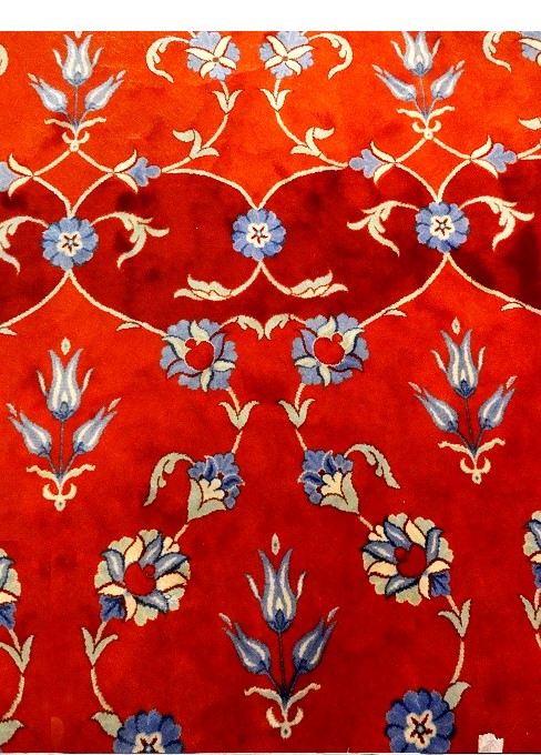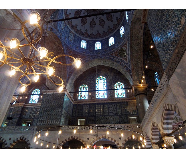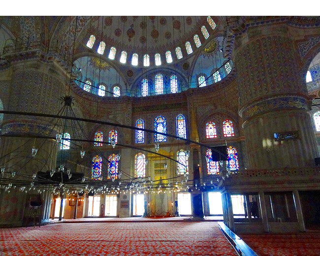 上ばかりではありませんよ、足元のじゅうたん。とても綺麗なイスラム文様。この一つの模様が一人分のお祈りの場所になっています |