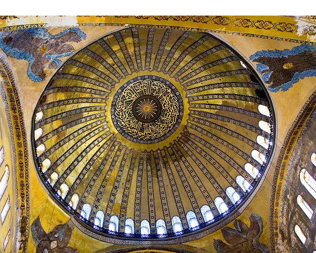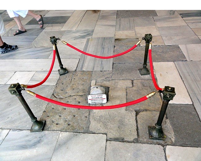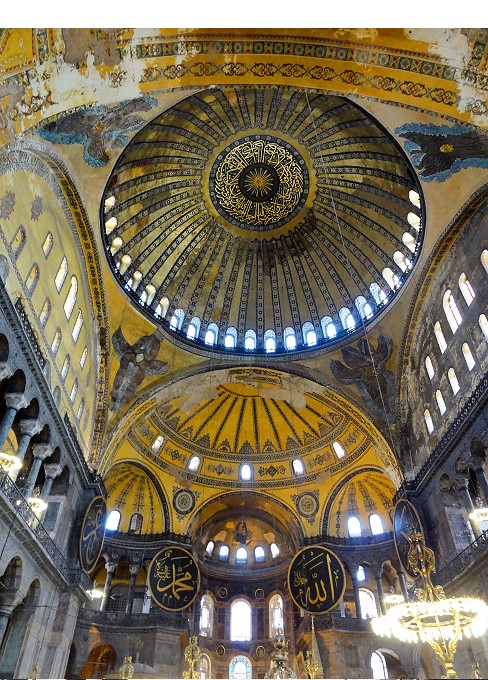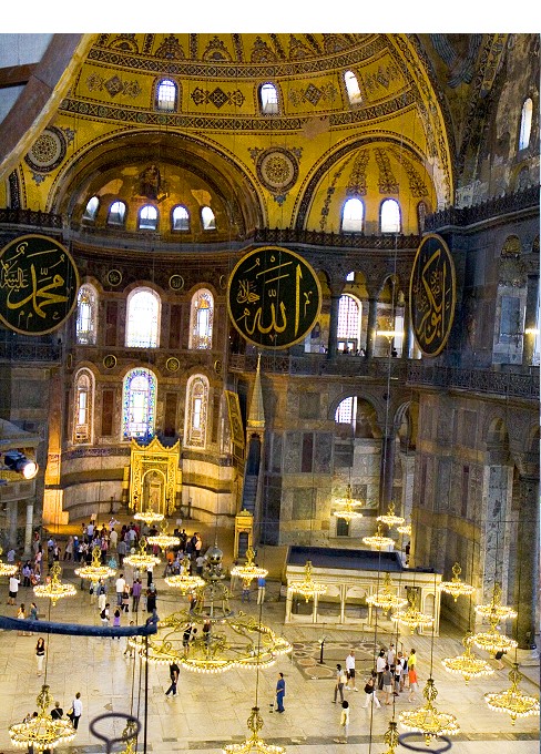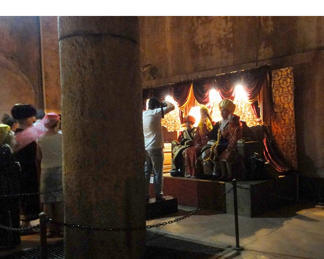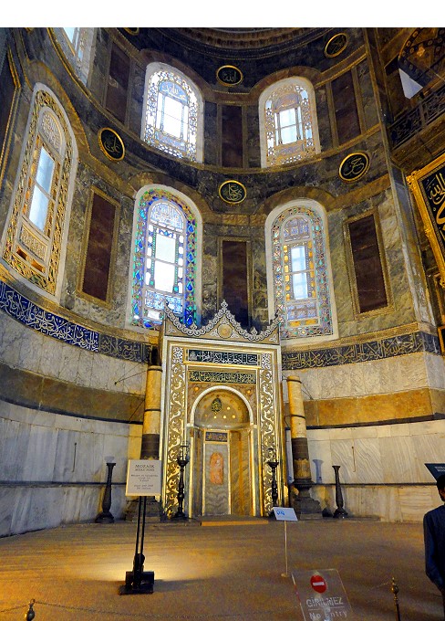 どう見てもブルーのステンドグラスの下が真ん中だよなぁ、なのに真ん中がずれてる。なぜなら、この部分はイスラム教ではメッカの方向を示すミフラーブ(入口)の場所。通常のモスクなら建物の中央になるように造られる筈ですが、アヤソフィアは元々は教会なので後からイスラム用にメッカの方向に向いたフラーブを作ったので微妙にずれていてバランスが悪い建物の作りになってます |
