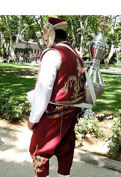 水系はちょっと怖いので飲めませんがこの衣装は伝統衣装なのか面白い。後ろに大きな水筒を担いでいます |
