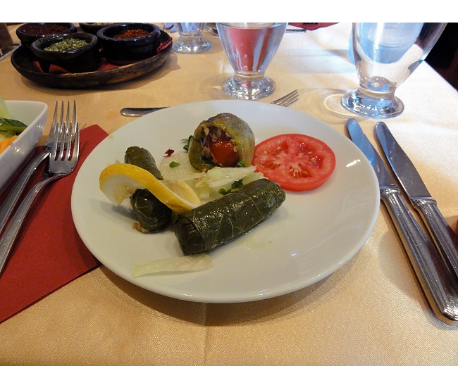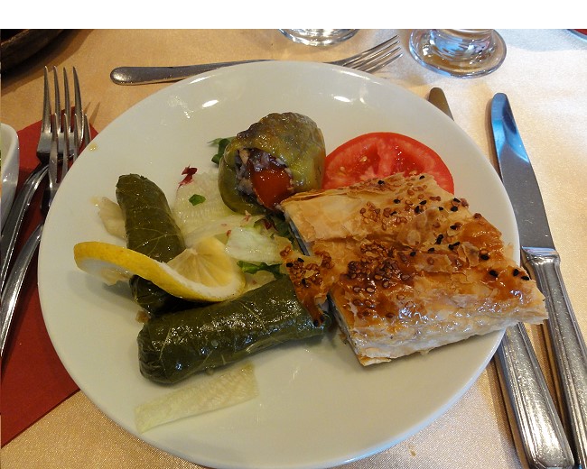 ブドウの葉を使った前菜とピーマンの肉詰め とホウレンソウのパイ |