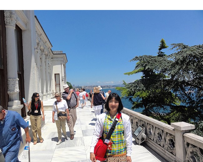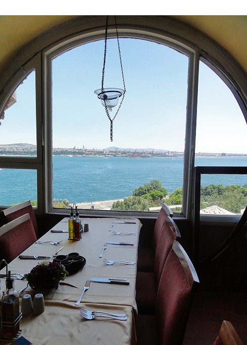 レストランの上はすぐ宮殿です。真っ白な宮殿とボスポラス海峡が生える風景です |