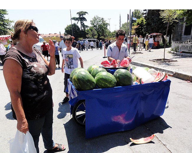 トプカプ宮殿出た所のスイカ売り。食べてみたいけどお腹すいてないので食べられへん |