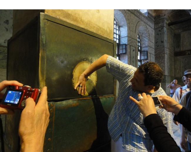 これは「マリアの手形」といわれる柱にある穴です。この中に親指を入れてくるっと1周回すことが出来たら願いがかなうんだとか。長蛇の列でした。私は信仰の深い方々の迷惑になったらあかんでみただけ |