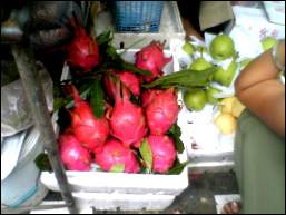 | ドラゴンフルーツという果物、中はキュウイみたいでそんなに甘くない。このフルーツの生ジュースはいけません、、。ミキサーにかけると種が粉砕されてマズ(笑) |