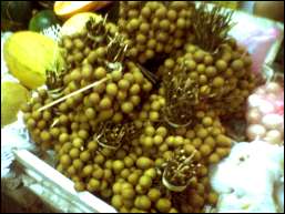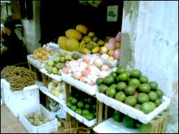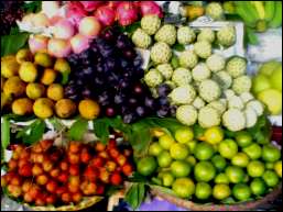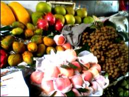 | 左下がマンゴスチン、その上がマンゴー、黒いのがプラム、その横がカスタードアップル、右下がミカン |