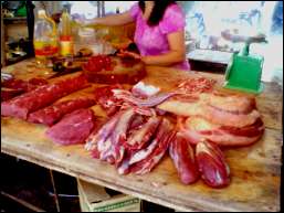 | これは多分?牛肉?水牛の可能性もある。冷蔵庫がないのでこうやって大きなまな板の上に並べて切り売りしているらしい。 |