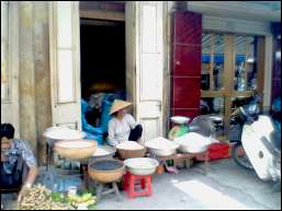 | 今日はようやくハノイ市内観光です。朝食にはフランス領だった名残でおいしいというバケットを食べました。今まで食べたフランスパンの中で一番美味しかった。ただしマンゴー生100%ジュースを頼んだのですが氷はダメって事で抜いて貰ったら生ぬるくて気持ち悪〜いジュースでした。冷蔵庫がないベトナムなのでフルーツも保管は常温(~~;) |