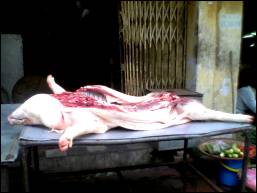 | 豚の開き?バイクで運ぶ時も生きたままこの形でくくりつけられていた。 |