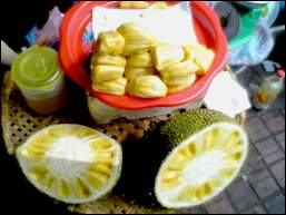 | ドリアンの仲間ジャックフルーツ、凄く甘いのですが口に入れた一瞬、置きっぱなしの雑巾の匂いがすると私は思います(~~;)あくまでも私の主観。。。 |