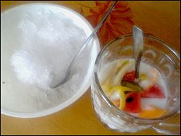 フルーツと白玉粉のような餅入りでココナッツがかかっていて氷を入れてかき混ぜて食べる。 |