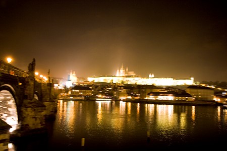 | 夜のカレル橋たもとからから見たプラハ城 |