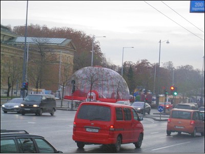 | 赤い車の向こうに見えてる透明のドームはクリスマスの時期だけ現れる子供の遊び場で、子ども達にお菓子などを配っているそうです 何か夢があっていいなぁ〜 っていうか私もあの中に入ってみたいぞ |