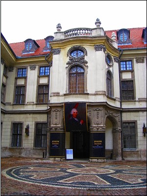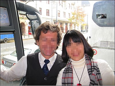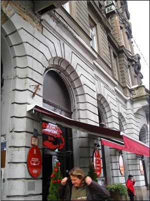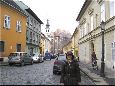 | 教会からすぐの所のハンガリー土産店で皆思い思いにハンガリーの物産を買い求め、(というかハンガリーで買い物する場所は他には無かったです 日本だと観光地っていえばたくさんのおみやげ物屋がありますがこの辺はぜ〜んぜん店がありません 商売っけがないっていうか…)私は店の前の通りをぶ〜らぶら。こちらはモーツアルトゆかりのイベントをしてました |