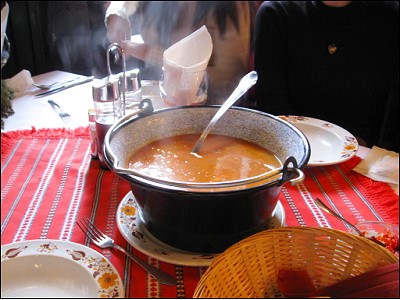 | ど〜んとテーブルに大量なスープが鍋ごと 届きました。ハンガリー名物のグヤーシュ とても4人で食べきれる量じゃございません |