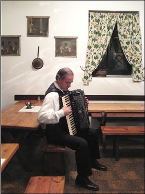 | 市内見学を終え、バス で郊外に30分程の所にたくさんある名物ホイリゲでの夕食です ホイリゲとはオーストリアのワイン酒場で自家製ワインと家庭的な料理とを出す居酒屋です |